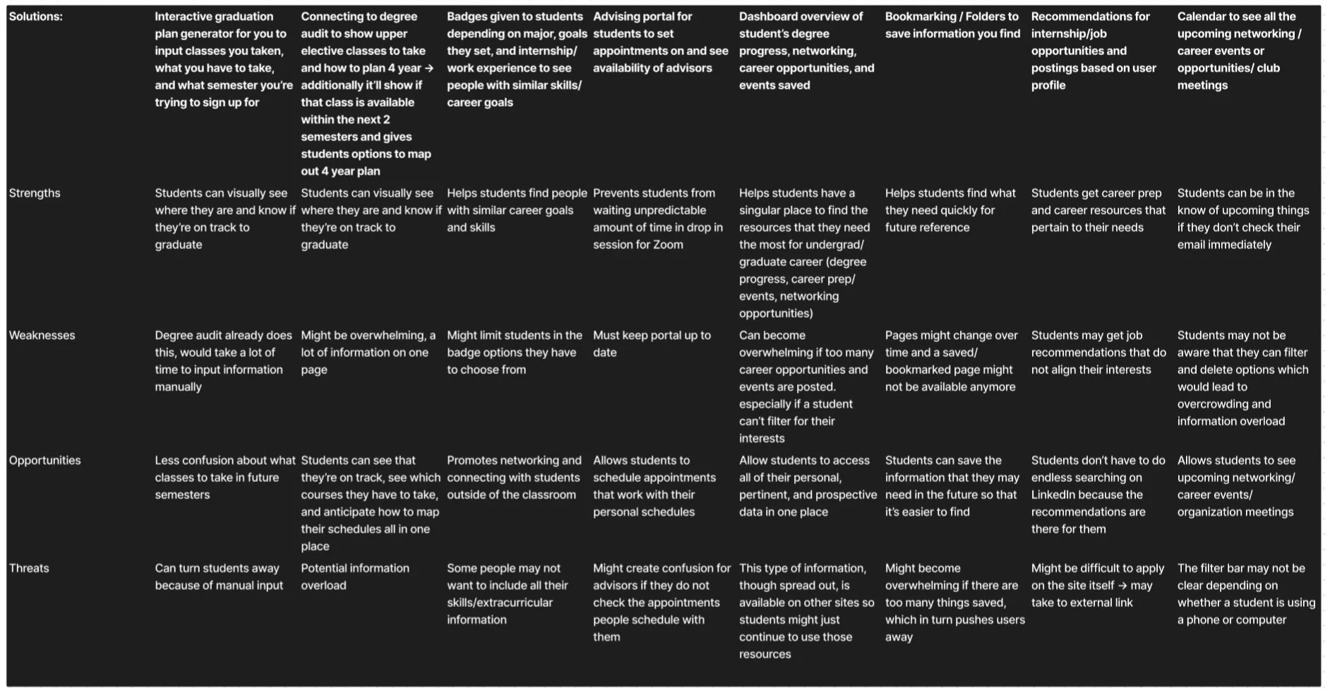 During the ideation phase of the project, we conducted in-person interviews with two graduate students and one undergraduate student. I also created a Google Form Survey that four undergraduate students, within the College of Information Science, answered. This was used to help the creation of user personas and to inform the design. Together with the team, we prepared an interview script with 17 open-ended questions, focusing on our target audience’s concerns about resource access and how they go about finding career/ networking opportunities. I interviewed one student, took notes for the second, and observed the final. We referenced the user interview findings throughout the entire design process.